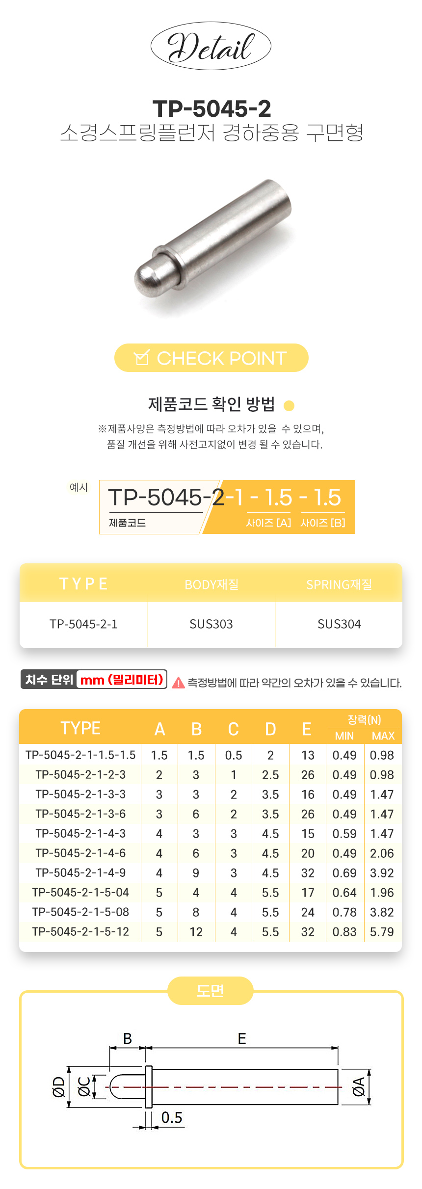 TP-5045-2 소경 스프링플런저 경하중용 구면형