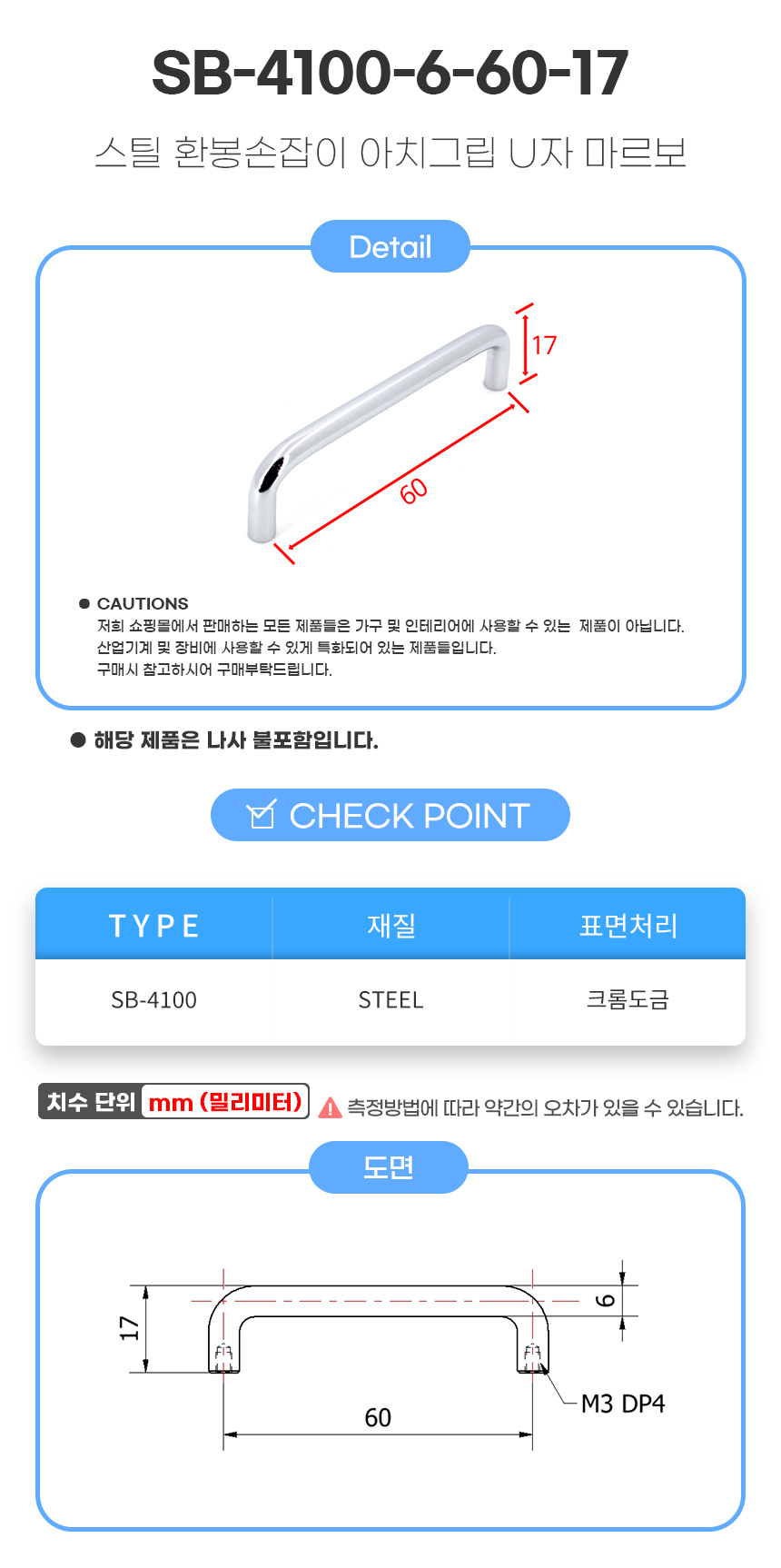철 환봉 손잡이 아치그립 U자 마르보 SB-4100-6-60-17